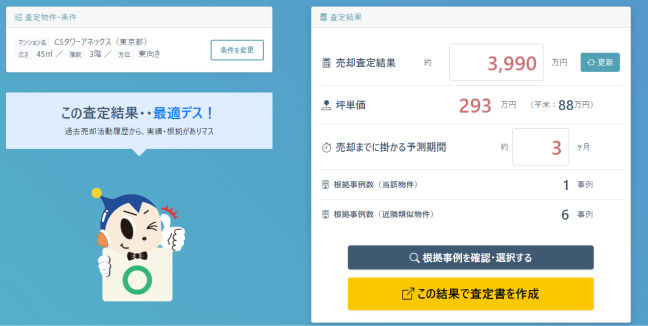 マンション名を入力するだけで、分譲マンションデータから候補マンションを自動で抽出できます。査定したいマンションを選択したら、あとは「専有面積」「階数」「方位」を入力するだけでマンション査定ができます。査定金額の根拠となるデータは、同一マンションの過去事例はもちろん、近隣の類似マンションの取引事例の2種類です。豊富な事例から精度の高い査定金額を自動で算出できます。
